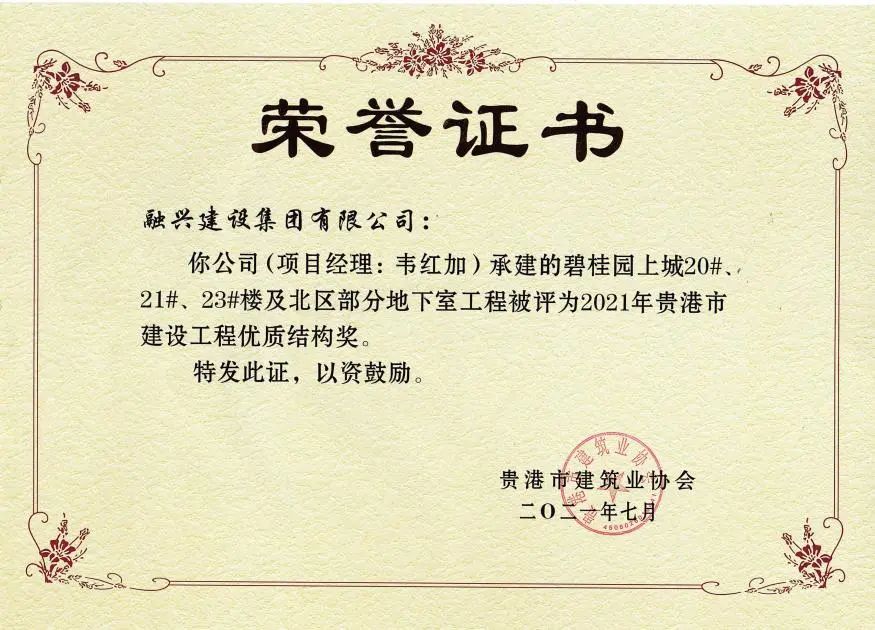 权威机构认证!碧桂园交投·中央上城荣获"2021年贵港市建设工程优质结构奖"称号